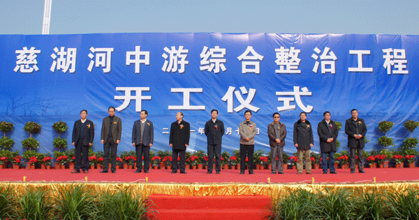 慈湖河綜合整治是馬鞍山市委、市政府確定的重點項目和民生工程。這次開工的整治工程位于慈湖河中游,自東環路至林里路河段,綜合治理河道長度6.7公里,規劃整治面積為149公頃,概算總投資13億元,采取BT方式進行融資建設,2015年全面完成。按照“上游是保障、中游是關鍵、下游是補充”的慈湖河總體整治思路,這次中游整治主要包括防洪排澇工程、生態景觀工程和水質改善工程三大部分。其中,防洪排澇工程主要實施左右岸約13公里的堤防整治達標和沿河6個匯水分區內的排澇泵站與涵閘建設;生態景觀工程主要實施沿河生態環境建設,包括綠色景觀、生活休憩、商務休閑、旅游觀賞、自然生態等生態景觀功能;水質改善工程主要實施王家山污水處理廠尾水利用和支流總口截污工程。