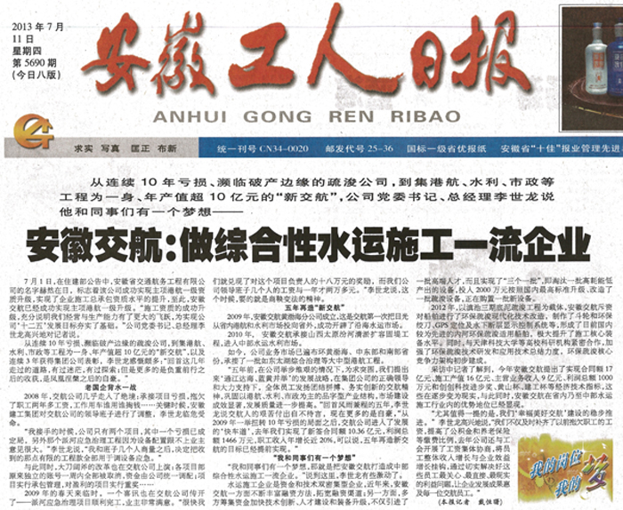 “我和同事們有一個夢想,那就是把安徽交航打造成中部綜合性水運施工一流企業(yè)。”說到這里,李世龍有些激動了。
