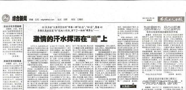編者按:安徽工人日?qǐng)?bào)8月8日2版頭條報(bào)道了交航公司青山河項(xiàng)目部項(xiàng)目經(jīng)理朱文明的先進(jìn)事跡。