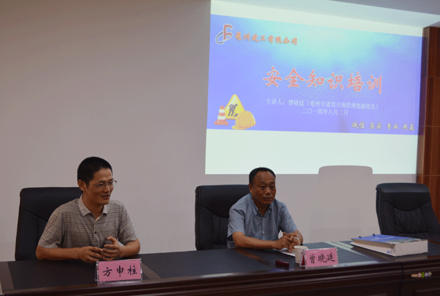 2014年8月2號,在亳州建工有限公司三樓會議室舉辦了建筑施工安全生產知識講座。本此講座由公司總經理方申柱主持,并有幸邀請了亳州市建筑市場管理處副處長曾曉廷前來授課。亳州建工全體員工、項目負責人等40余人參加了這次培訓。