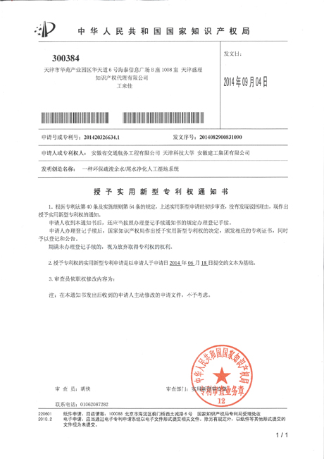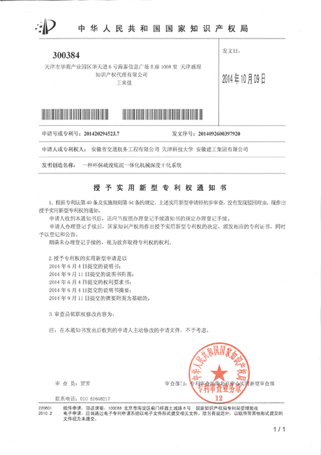 近日,國家知識產權總局專利管理司傳來喜訊,我公司獲得兩項實用新型專利授權,《一種環保疏浚底泥一體化機械深度干化系統》,專利號:201420294523.7,《一種環保疏浚余水/尾水凈化人工濕地系統》,專利號:201420326634.1,這是公司重視“科技興企”戰略的重要成果,實現了公司在專利申請方面零的突破,同時為提高公司技術能力和深入實施“科教興企”戰略打下了堅實的基礎。