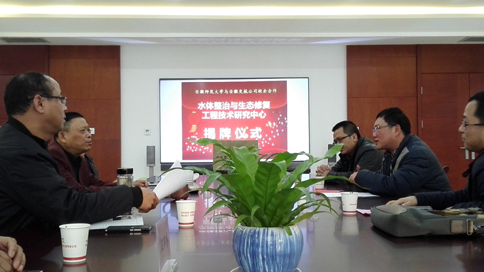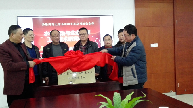 2016年1月2日,安徽師范大學(xué)環(huán)境科學(xué)與工程學(xué)院院長趙廣超一行來我公司考察。公司董事長、黨委書記、總經(jīng)理李世龍,副總經(jīng)理方申柱、劉朝發(fā),總工辦副主任衛(wèi)邦齊等參加。雙方為共同成立的“水體整治與生態(tài)修復(fù)工程技術(shù)研究中心”揭牌。