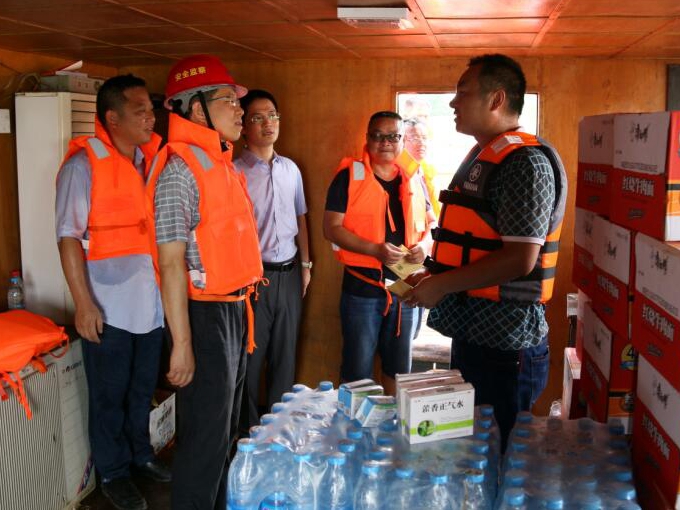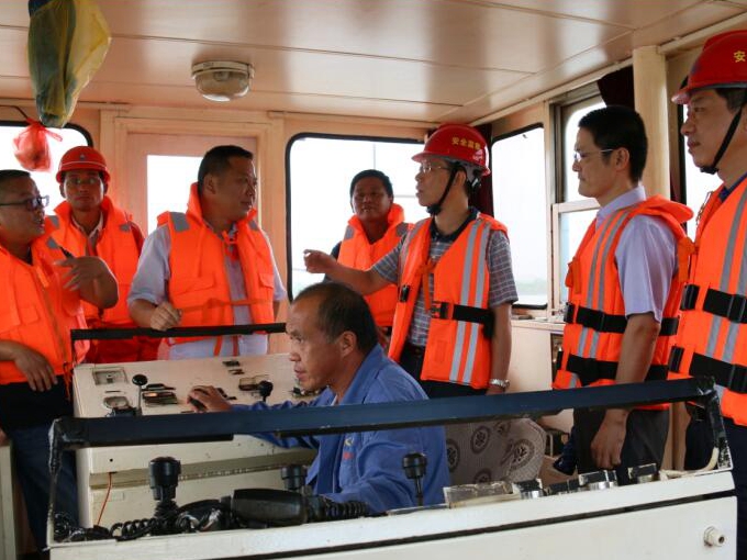 7月14日上午,集團公司副總經理王厚良、安全監察局副主任葛輝在安徽交航公司副總經理方申柱、總經理助理、疏浚分公司總經理董雙武的陪同下來到青弋江南陵縣四七圩倉溪段堤壩抗洪搶險第一線現場指導抗洪搶險工作。王總一行首先登上正在青弋江河道中進行河道清淤的“蛟龍號”,查看施工作業進度,指導安全度汛工作。他與船員們親切交談,詳細了解船舶作業原理、了解施工中遇到的難點,指導船員們在施工過程中在安全方面應該注意的事項,囑咐安徽交航公司要做好船員生活的后勤保障工作。上岸后一行人又驅車趕往南陵縣四七圩倉溪段堤壩抗洪搶險第一線,乘坐沖鋒舟,登上正在潰堤處進行施工作業的抓斗船。登船后,王總與在船上值守的南陵縣水務局局長鄭松淼進行親切交談。鄭局長感謝安徽建工、安徽交航公司對當地政府抗洪救災給予的大力支持,王總表示抗洪搶險是我們國有企業應當承擔的社會責任,是應該的。王總詳細查看了船上作業設備詢問了施工進度,對辛苦作業的職工們給予鼓勵和問候,囑咐職工們在作業同時要注意自身安全,并送上了慰問品和慰問金。職工們感謝集團領導的關心,并紛紛表示將不辱使命,發揚安徽建工人不怕苦不怕累,勇于拼搏的精神,爭取盡早完工,讓災民們早日回到家中。