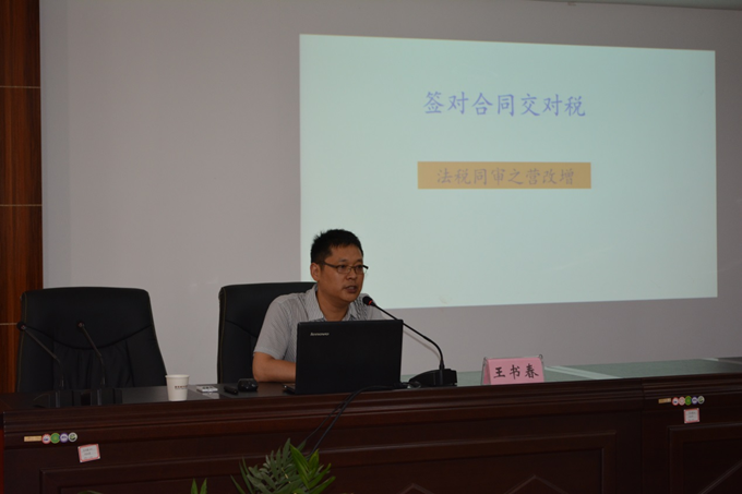 王律師首先講解了何為法稅同審、稅收是如何產生的及“營改增”相關基本稅收與法律知識,同時數例并舉,以鮮活實例闡述了合同的簽訂對公司稅負的直接影響;隨后王律師結合建工公司經營實際,著重講解了“營改增”對建筑行業稅負的影響,并對公司的經營管理、稅收籌劃提出了針對性的意見及建議,特別是對經濟合同簽訂時的涉稅條款審查提出了具體的把控要點。最后王律師與各位學員進行了互動交流,對工作中存在的問題作一一解答。