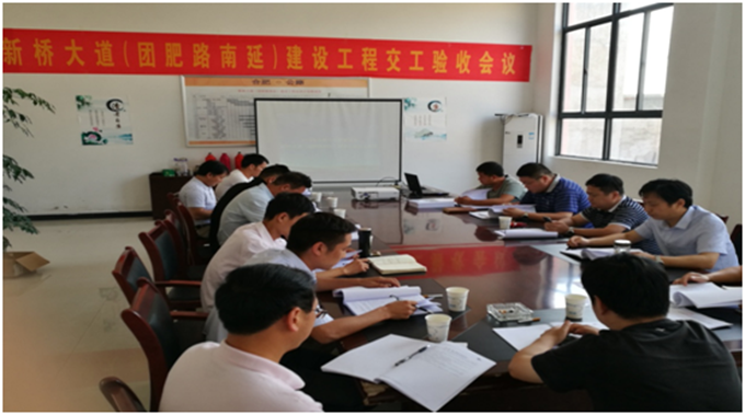 2016年9月20日,新橋大道(團肥路南延)建設工程02、03標段交工驗收會議在小廟鎮新橋大道項目辦會議室隆重召開。與會專家聽取了各參建單位的總結報告后,合肥市交通質量監督站鮑站長宣布新橋大道建設工程質量合格,同意交工。