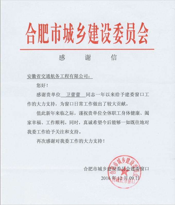 合肥市建委窗口向安徽交航發來感謝信