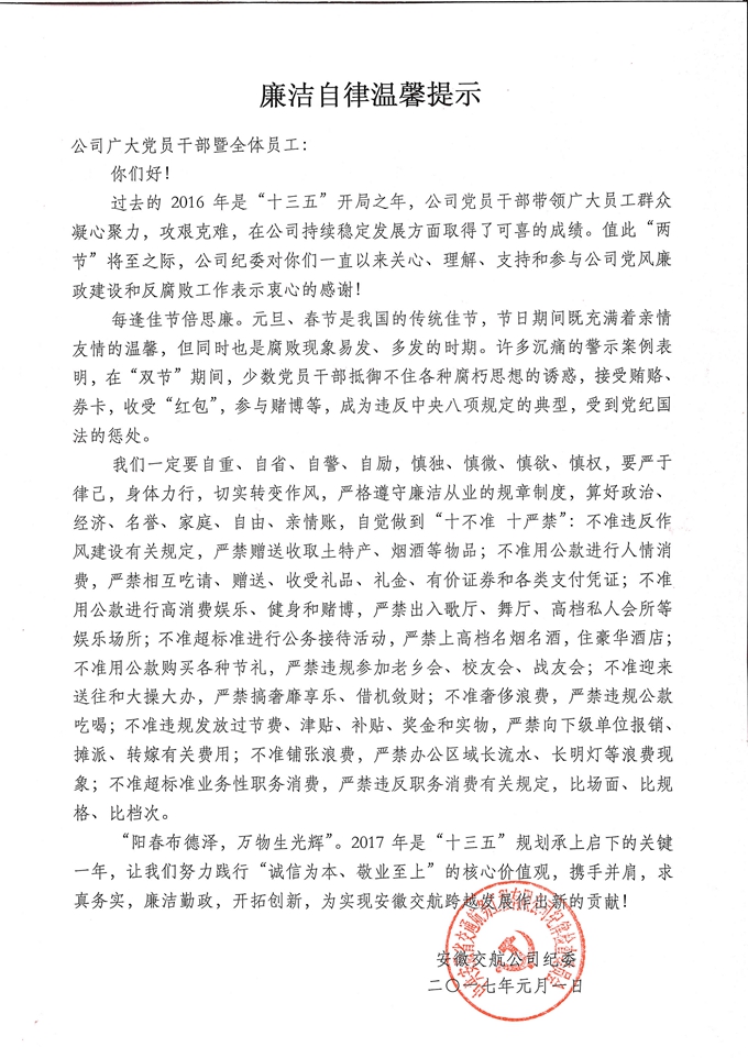 為貫徹落實集團公司紀委《關于做好2017年元旦春節期間作風督查工作的通知》精神,進一步加強安徽交航公司黨風廉政和作風建設,元旦、春節前夕,公司紀委分別向分公司負責人、各項目經理發出了“廉潔自律溫馨提示”信,提醒并要求他們廉潔自律,自覺遵守黨紀國法,嚴格貫徹落實中央“八項規定”精神和省委“三十條”規定,持之以恒反對“四風”,做到“廉潔過節,過好廉節”。