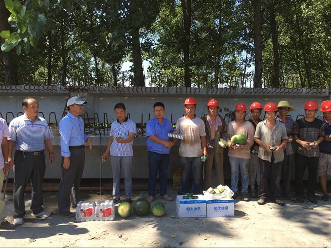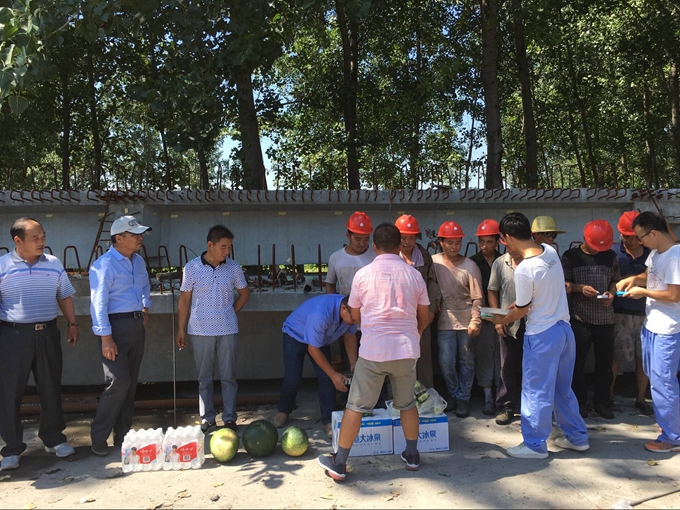7月23日,蕭楊路項目工地上,工人們從蕭楊路項目部工作人員和業(yè)主、監(jiān)理單位領(lǐng)導手中接過一件件送來的防暑降溫用品。當日蕭縣進入37℃以上的“燒烤”模式,為給在高溫環(huán)境下辛苦工作的工人們送去一份清涼,保證工人們身心健康,蕭楊路項目部會同業(yè)主單位、監(jiān)理單位開展了“送清涼”到工地活動。
