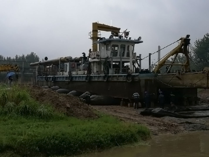 在此期間,我公司“皖吸十一號”等九艘船舶已在鳳臺鑫舶瀚船廠進行修理。由于該船廠沒有承接大噸位挖泥船上坡的經驗,在淮河水位較低的情況下他們提出的幾個方案無法落實,而淮河流域附近又沒有更合適的船廠可以完成上坡工作。商經理憑著數十年的工作經驗,積極聯系有資質、有經驗的外協人員參與作業。8月12日商經理利用周末休息時間再次冒雨親赴現場指揮,終于使“皖吸11號”順利安全上坡并加以固定。