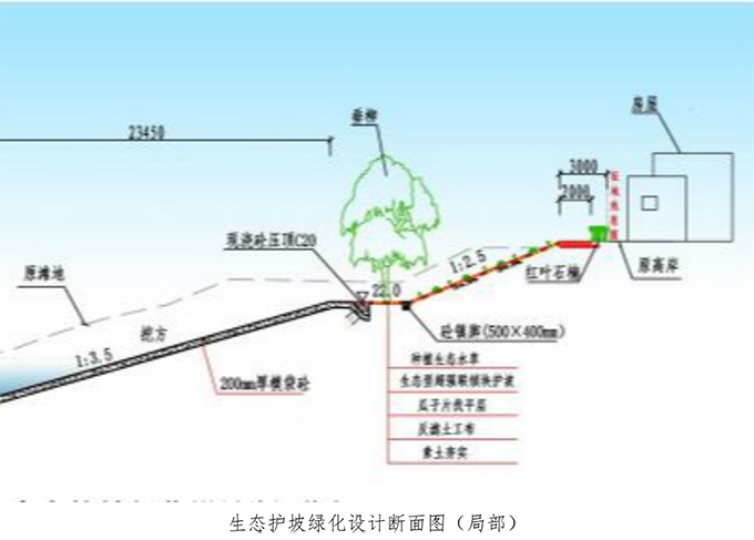 護岸工程。本工程岸坡防護,頂部防護至河道原有河灘地,底部為防止基礎受進一步淘刷二防護至河底。在正常蓄水位22.0處設平臺,平臺以及平臺以上至堤頂采用生態型連鎖塊護坡,平臺以下范圍內采用生態膜袋砼護岸,坡頂設置兩米寬C30混凝土路面,路面靠岸側種植灌木。