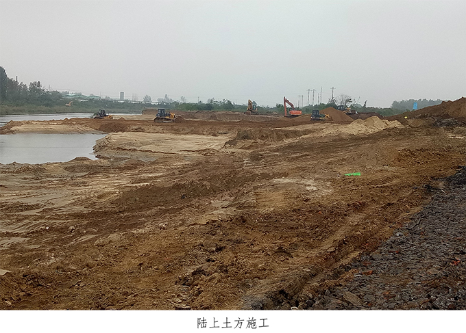 疏浚工程。選用合適挖泥船船型是工程順利進行的關鍵,本項目采用全分體式、斗輪式挖泥船,便運輸,適合開挖四級以上土類型,設備性能可靠,功效高。水下土方主要采用絞吸式挖泥船施工,管道輸送;表層土含樹根等雜物,采用抓斗船清障;陸上土方采用挖掘機開挖,渣土車運輸。
