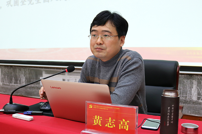 黨的十九大精神安徽“百人宣講團”成員、安徽省馬克思主義學會常務理事、安徽省科學社會主義學會常務理事、安徽省中共黨史學會理事、安徽大學馬克思主義學院副教授、碩士生導師黃志高以《學習黨章 尊崇黨章》為題,從黨章的類型與作用、黨章的演進與發展、黨章的結構與內容、黨章的學習與尊崇等方面全面、客觀、準確、透徹地解讀了《中國共產黨章程》。針對黨的十九大修改的黨章條文,黃教授從修改背景、修改意義等方面逐一作了深入闡述。