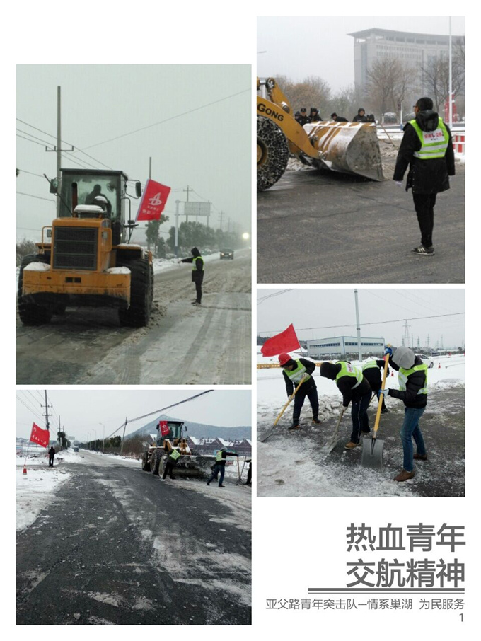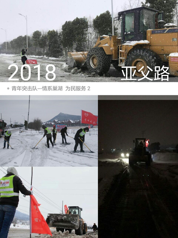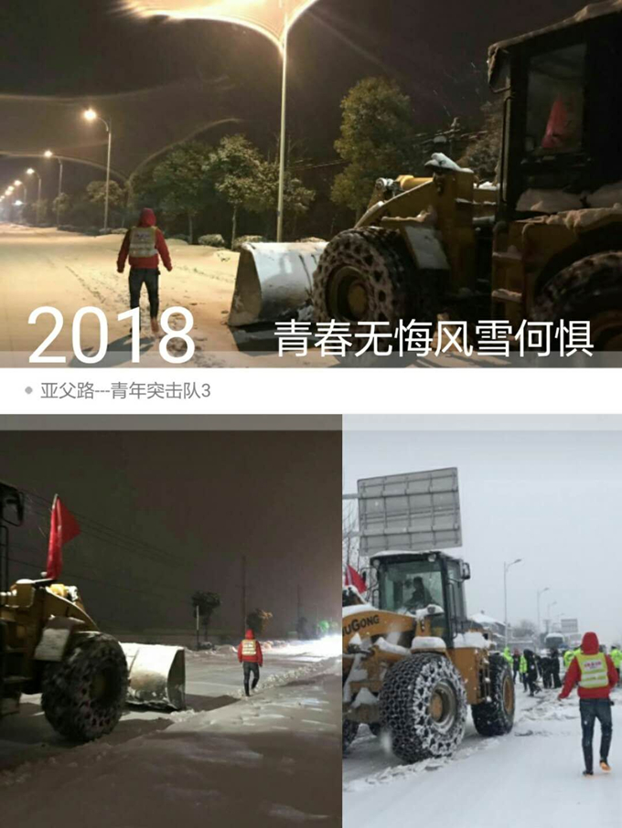 2018年1月27日,巢湖市迎來了一場大雪,紛飛的大雪持續了整夜,零下低溫導致路面結冰嚴重,出行十分不便。亞父路項目部青年突擊隊積極響應巢湖市政府的號召,組織了一支鏟雪突擊小組,在長江東路、亞父路開展鏟冰除雪活動,為市民“開路”。