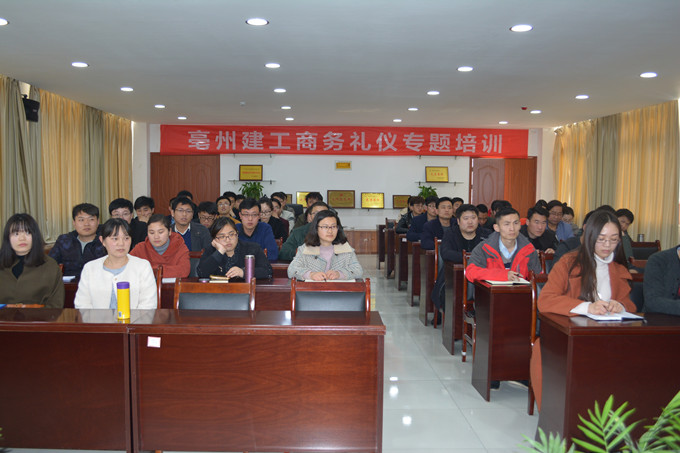 為培養員工良好的禮貌禮儀、行為規范,提高服務意識,塑造良好的個人形象及企業形象,3月23日下午,亳州建工特邀亳州學院中文系王虹講師對公司本部全體員工、各項目部部分員工及新入職員工進行了商務禮儀專題培訓。