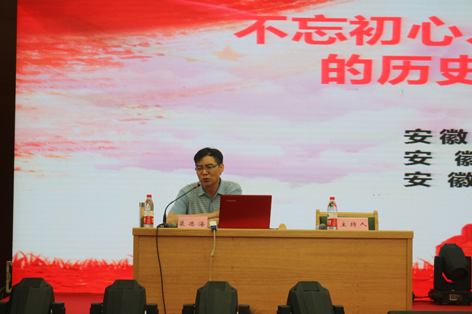 會議邀請了安徽大學哲學系教授裴德海為大家作《“不忘初心、牢記使命”主題教育的歷史內涵及時代價值》專題報告。裴教授從明確初心、堅定初心、固化初心、守望初心、證明初心五個方面詳細闡述了中國共產黨的誕生和發展歷程,以及中國社會和人民最終選擇中國共產黨的根本原因。同時深入解讀了新時期、新形勢下中國共產黨開展“不忘初心、牢記使命”主題教育的歷史和現實意義,讓大家明白了“四大考驗”和“四種危險”要求全體共產黨人必須“不忘初心、牢記使命”。裴教授用大量史實和案例為大家上了一堂精彩生動的培訓課程,讓大家進一步了解了黨的艱辛發展歷程和建黨以來取得的巨大成果,為深刻理解“不忘初心、牢記使命”主題教育的重大意義提供了獨特的思路和見解。