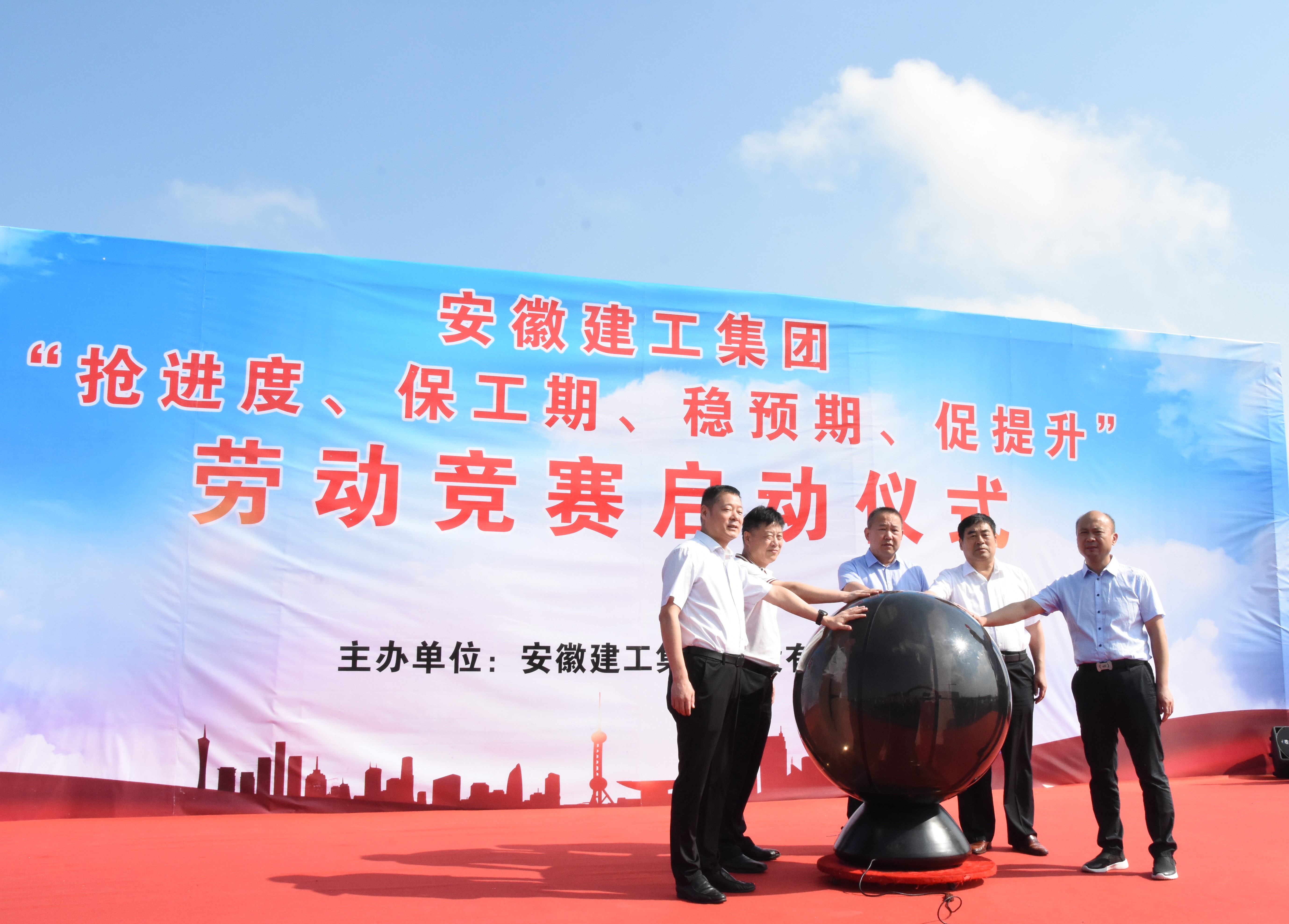 活動(dòng)最后,由安徽建工集團(tuán)股份公司總經(jīng)理許克順宣布勞動(dòng)競賽啟動(dòng),并與蒙城縣委副書記、縣長孔祥永,蒙城縣副縣長于杰,股份公司副總經(jīng)理孫學(xué)軍共同按下啟動(dòng)球,安徽建工集團(tuán)2019年度“搶進(jìn)度、保工期、穩(wěn)預(yù)期、促提升”勞動(dòng)競賽活動(dòng)正式啟動(dòng)。