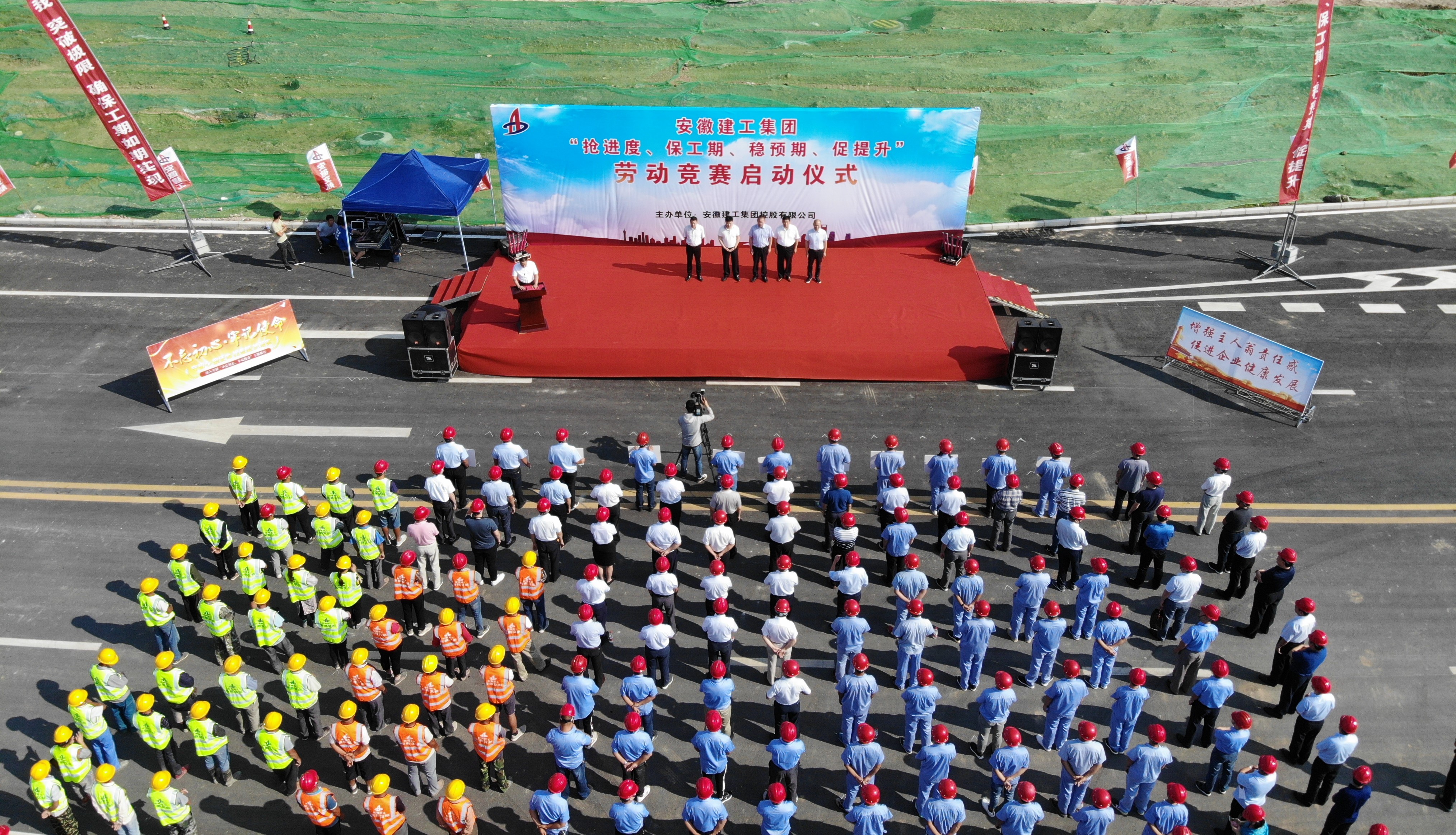9月4日,安徽建工集團(tuán)“搶進(jìn)度、保工期、穩(wěn)預(yù)期、促提升”勞動(dòng)競賽啟動(dòng)儀式在安徽交航蒙城職教園項(xiàng)目隆重舉行。蒙城縣委副書記、縣長孔祥永,副縣長于杰,縣政協(xié)副主席、交通運(yùn)輸局局長胡春雨,縣發(fā)展和改革委員會(huì)、縣人力資源和社會(huì)保障局、縣教育局、縣工會(huì)、縣住房和城鄉(xiāng)建設(shè)局、縣交通運(yùn)輸局有關(guān)部門人員;安徽建工集團(tuán)控股有限公司黨委委員、安徽建工集團(tuán)股份公司董事、總經(jīng)理許克順,安徽建工集團(tuán)股份公司董事、副總經(jīng)理孫學(xué)軍,安徽建工集團(tuán)控股有限公司工會(huì)副主席李世龍,技師學(xué)院、安徽交航、安徽水利、安徽路橋及第三方單位200余人參加活動(dòng)。