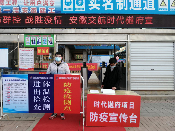 “抗疫”之時,時代樾府項目積極貫徹落實中央、省委、省國資委、集團黨委及公司黨委關于疫情防控和復工復產的部署安排,采取諸多有效措施做到“防疫、復工復產兩手抓”,于2020年2月24日正式復工。堅定黨委領導、黨員帶頭模范、強化宣教陣地、體現國企擔當。在集團黨委及公司黨委的領導下,項目部在做好防疫工作的同時積極推進復工復產工作。黨員干部沖鋒在前,切實做到“四帶頭”,充分發揮黨員干部的帶頭作用,調動職工群眾抗疫的積極性。做好疫情宣傳工作,項目已制作宣傳條幅30個、宣傳牌45個、宣傳冊300冊,并有3個擴音器循環播放“疫情防護知識”,“帶頭抗疫、共同抗疫”是最大的宣傳。