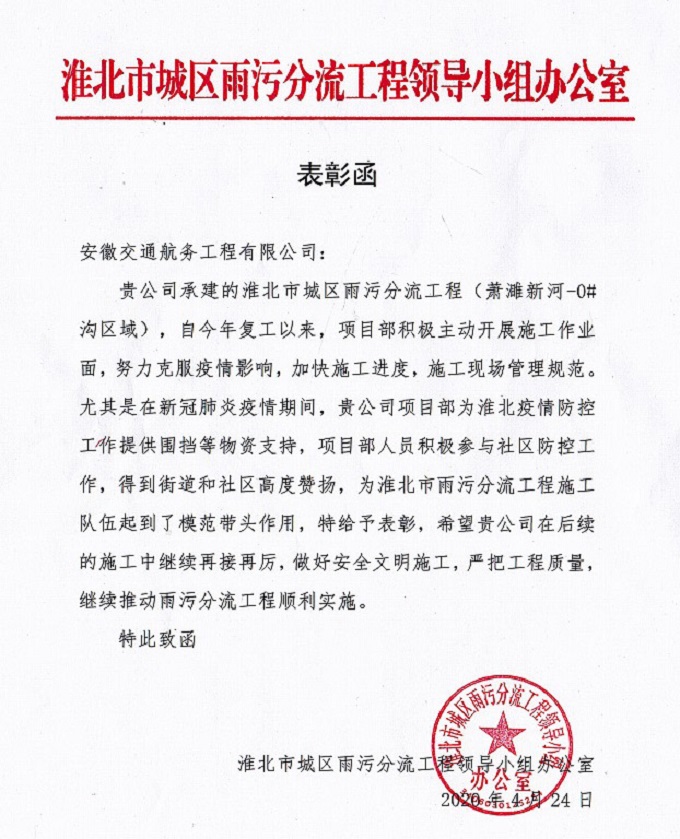 日前,淮北市城區雨污分流工程領導小組辦公室發來表彰函,對安徽交航公司在淮北雨污分流工程項目中積極推進復工復產及疫情防控工作給予了高度贊揚,并希望安徽交航公司在后續施工中再接再厲,做好安全文明施工,嚴把工程質量,繼續推動雨污分流工程順利實施。