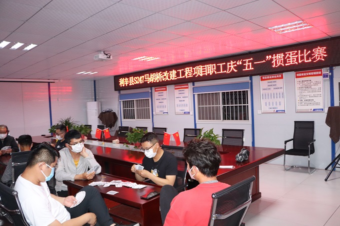 在5月1日當天晚上,利辛縣S247馬胡橋改建工程項目部利用晚餐后時間,積極組織全體員工在項目會議室舉辦摜蛋比賽,本著“公平、公開、公正”的原則,員工自由組隊通過抽簽決定對手。比賽中,選手組員之間密切配合,相互切磋牌技,歡聲笑語此起彼伏,經過多輪次比拼,最終選拔出一等獎一組、二等獎一組、三等獎一組,最后項目經理為一二三等獎獲得者頒發了獎品。
