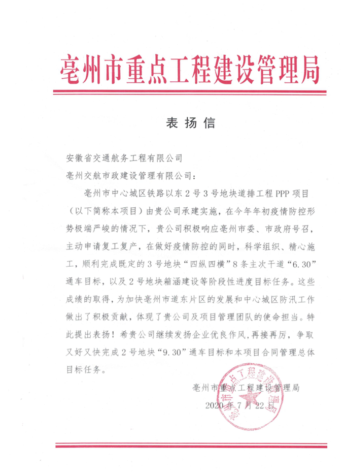 信中高度表揚了在今年年初疫情防控形勢極端嚴峻的情況下,安徽交航公司積極響應亳州市委、市政府的號召,主動申請復工復產,在做好疫情防控的同時,科學組織、精心施工,順利完成了既定的3號地塊“四縱四橫”8條主干道“6.30”通車目標,以及2號地塊箱涵建設等階段性的進度目標任務,充分彰顯了國企的使命與擔當。同時,信中希望安徽交航公司繼續發揚企業優良作風,再接再厲,爭取又好又快的完成2號地塊“9.30”通車目標和本項目合同管理總體目標任務。