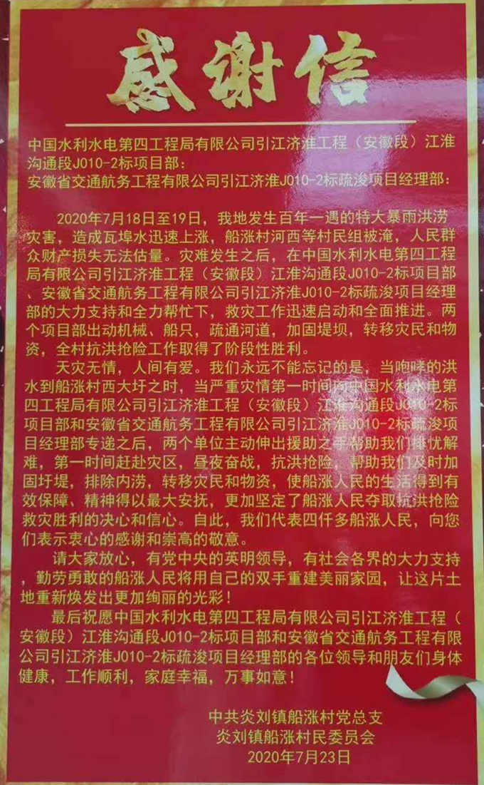 7月23日,中共炎劉鎮船漲村黨總支和炎劉鎮船漲村村民委員會發來一封感謝信,信中高度贊揚了安徽交航引江濟淮項目部在參與當地抗洪救災工作中的擔當與作為,并且當地村委還在信中代表四千多位船漲村民表達了由衷感謝。