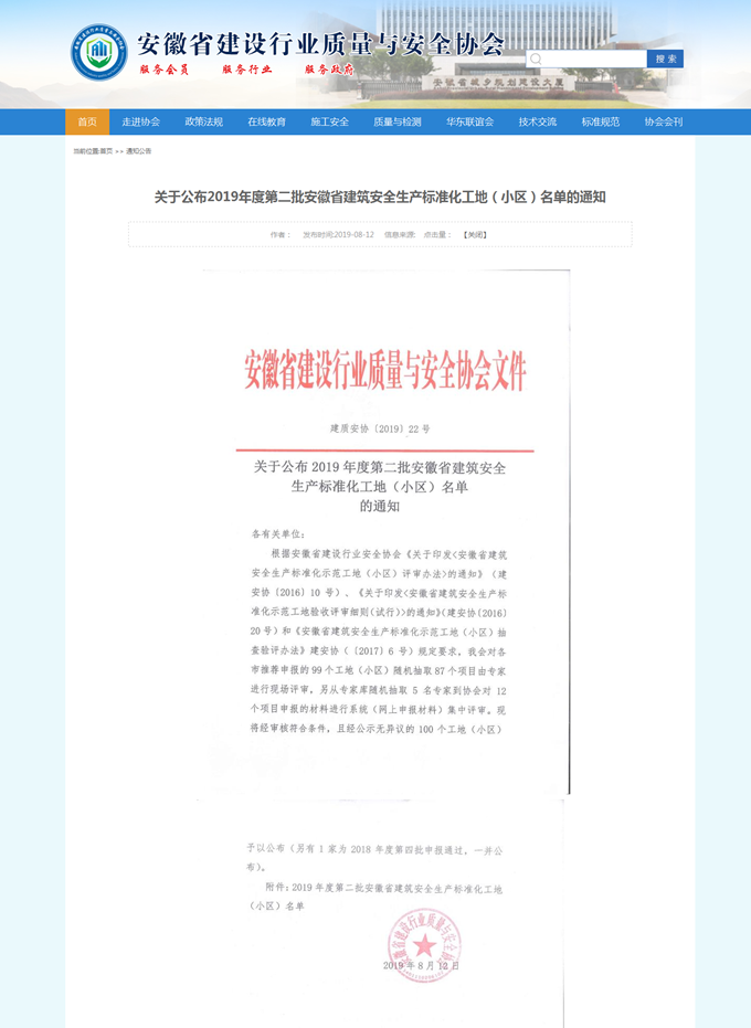 8月7日,安徽省建設行業(yè)安全協(xié)會正式公布了《2019年度第二批安徽省建筑安全生產(chǎn)標準化工地(小區(qū))名單》,安徽交航公司承建的合軌4號線TJ03標項目位列其中,榮譽獲評“安徽省建筑安全生產(chǎn)標準化工地”。