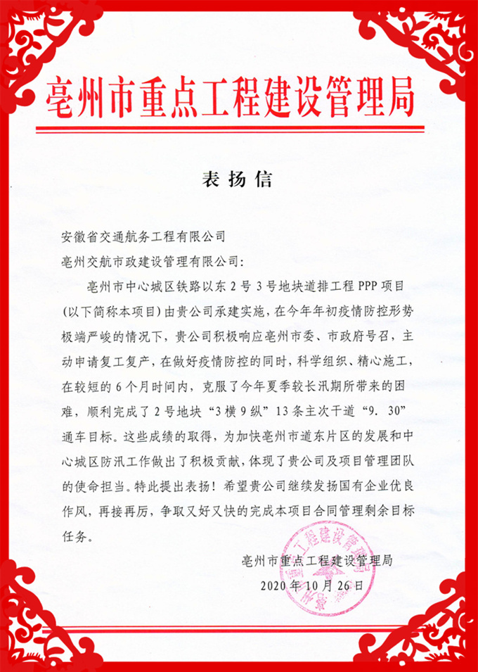 10月26日,安徽交航公司亳州PPP項目收到亳州市重點工程建設管理局發來的表揚信,信中對亳州PPP項目部克服重重困難順利完成“9.30”通車目標給予了高度表揚。