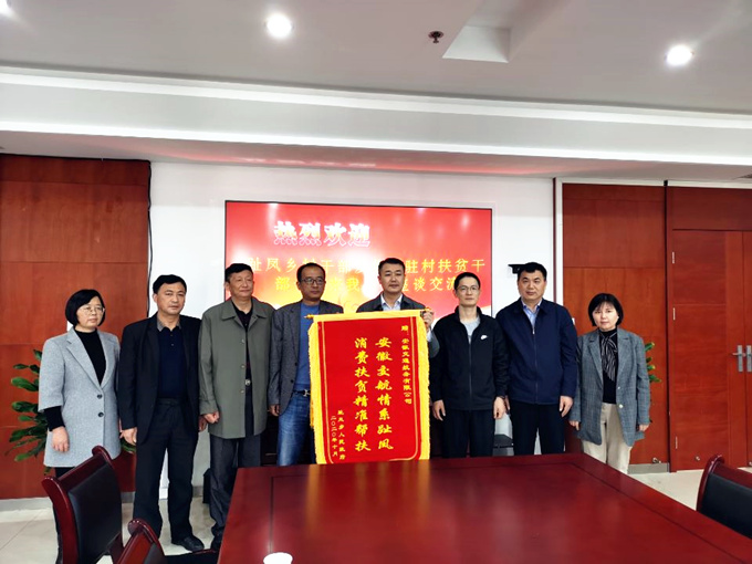 10月31日上午, 集團派駐宿松縣趾鳳村扶貧工作隊隊長、第一書記鄭軍,趾鳳鄉黨委委員、武裝部長吳行舟,趾鳳村“兩委”班子一行到訪安徽交航公司,將一面寫著“安徽交航情系趾鳳,消費扶貧精準幫扶”的錦旗送到了公司黨委副書記、總經理方申柱手中,對公司消費扶貧精準幫扶工作表達誠摯的感謝。座談交流中,雙方就趾鳳村如何增添幫扶舉措及鞏固扶貧成效等方面進行了深入的溝通和交流。