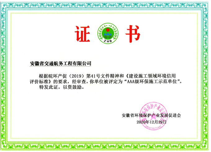 近日,經(jīng)安徽省環(huán)境保護(hù)產(chǎn)業(yè)發(fā)展促進(jìn)會(huì)評(píng)估,安徽交航公司再次榮獲“AAA級(jí)環(huán)保施工示范單位”稱號(hào)。