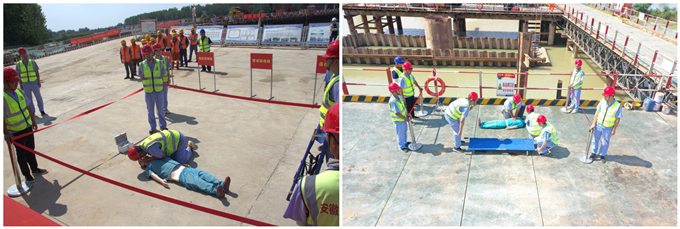 此次演練的具體提內容分為假設溺水事故和觸電事故應急救援兩部分,共設立保衛(wèi)疏導組、醫(yī)療救護組、警戒聯(lián)絡組以及物資保障組四個小組,旨在檢驗項目部安全生產應急預案中存在的問題,不斷完善和提高應急預案的科學性、實用性和可操作性,規(guī)范相關應急處置流程,強化項目部各部門、各崗位之間的協(xié)調配合。