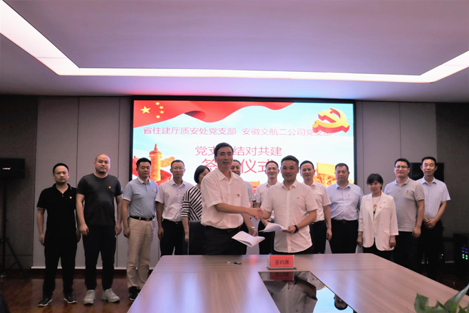 8月19日下午,安徽省住建廳工程質量安全監管處黨支部來安徽交航引江濟淮新時代文明實踐點開展“支部建在工地上”主題黨日活動,并與二公司黨支部簽訂結對共建協議。省住建廳工程質量安全監管處處長何以文、副處長陳鐘,三級調研員丁金穎、四級調研員董理論;公司黨委書記、董事長方申柱,黨委副書記、工會主席黃國平,黨委委員、副總經理張瓊等領導參加活動并見證簽約。