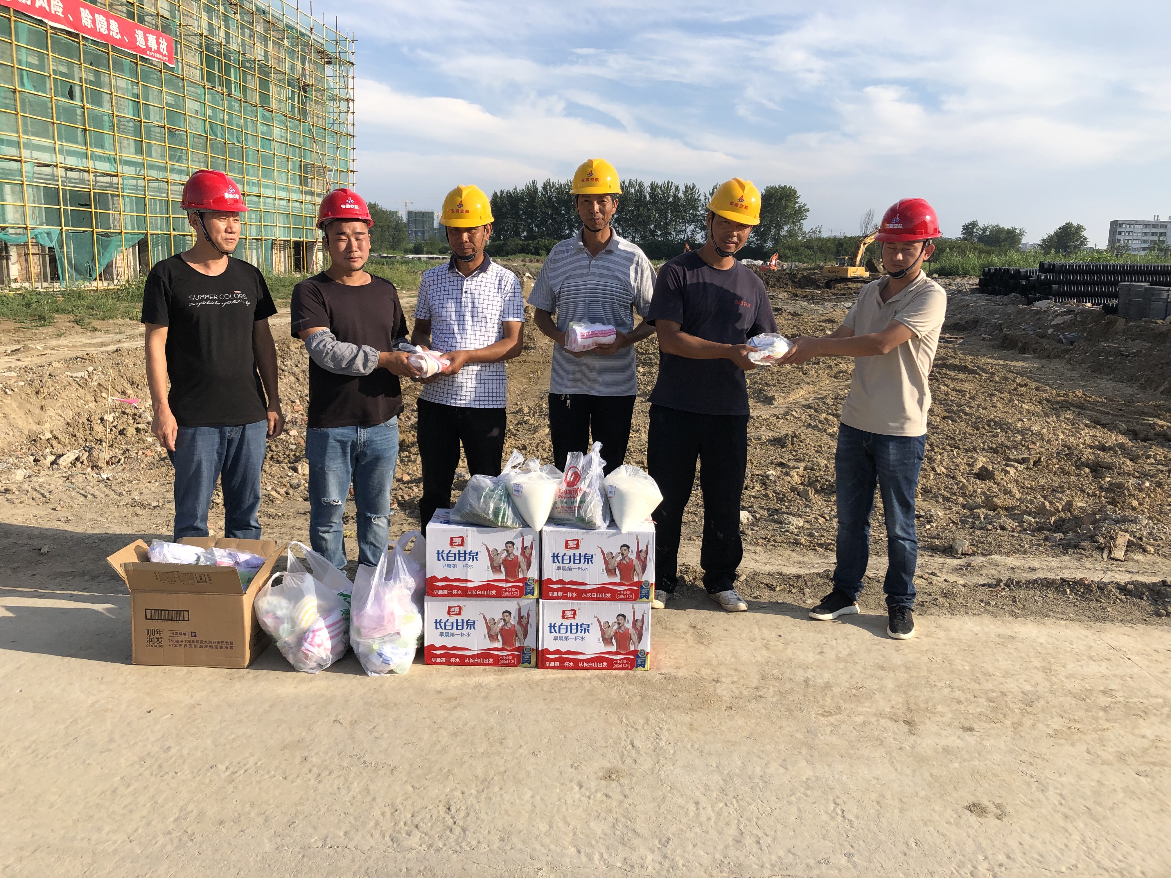 大暑雖已過去,可氣溫依舊炎熱,為了加緊工期,現場施工人員起早貪黑的在工作崗位上辛苦勞作。多金泗縣國際汽車城EPC項目黨支部開展了送清涼黨日活動,為奮戰在一線的民工兄弟們送去礦泉水、綠豆、花露水等防暑降溫物品,感謝他們為施工生產所做的努力和貢獻。