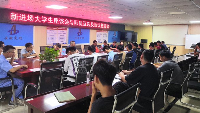 9月2日18:30,滁州項目開展大學生座談會暨導師帶徒活動,組織9對師徒簽署師徒協議。項目部全體黨員、青年骨干及新入職大學生。會議由支部書記田龍主持。