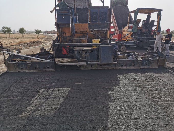 6月3日下午,在利辛S338省道,水泥穩定碎石面層試驗段施工現場,隨著攤鋪機的一聲轟鳴,第一車混合料緩緩地導入攤鋪機內,利辛S338工程水泥穩定碎石面層正式拉開攤鋪序幕。該攤鋪段在K6+200-K6+500全幅,總長300米,壓實厚度是18cm。