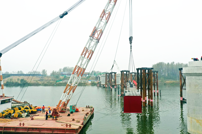 10月28日下午4點10分,隨著一節重達53噸的鋼箱梁穩穩地架設到馬胡橋4#主墩支座位置上,利辛S247馬胡橋項目首節鋼箱梁架設宣告成功,標志著馬胡橋進入鋼箱梁“拼積木”階段,主橋上部結構施工將進入“快車道”。
