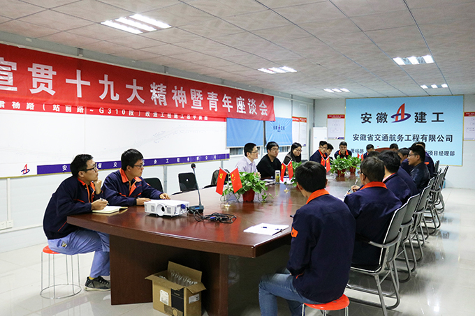 11月8日,安徽交航黨委副書記、常務副總經(jīng)理方申柱先后赴淮北市中湖礦山地質(zhì)環(huán)境治理PPP工程項目、蕭縣蕭楊路(站前路~G310段)改造工程項目宣講黨的十九大精神,并在各自項目部駐地召開青年座談會,傾聽青年心聲、了解青年需求;公司副總經(jīng)理汪崇龍,黨委委員、總經(jīng)理助理邵佳,黨委辦公室、經(jīng)營公司有關(guān)人員以及項目部全體職工聆聽宣講、參加座談。