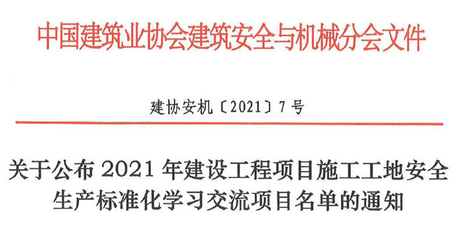 近日,中國建筑業協會建筑安全與機械分會公布了2021年在全國范圍組織學習交流的建設工程項目施工安全生產標準化工地名單,安徽交航公司承建的滁州市北京城房·時代莊園項目位列其中,獲評“全國建設工程項目施工工地安全生產標準化學習交流項目”。