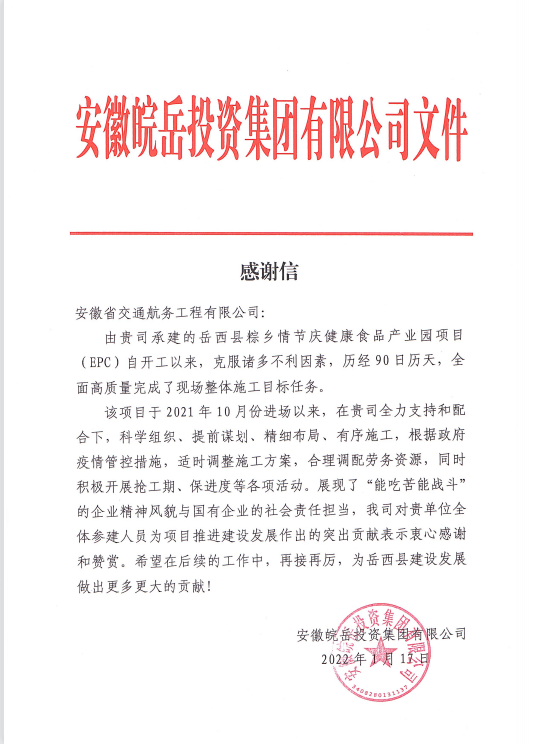 日前,公司收到業(yè)主方皖岳集團感謝信,對公司岳西縣粽鄉(xiāng)情節(jié)慶健康食品產業(yè)園項目部全體參建人員為推進項目建設作出的突出貢獻表示衷心感謝。
