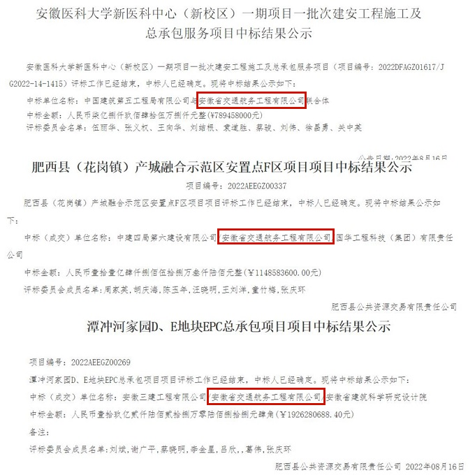 8月11日,是一個安徽交航公司的“大日子”,一天拿下兩個大項目近27億元訂單。安徽交航與中國建筑第五工程局有限公司聯合體中標安徽醫科大學新醫科中心(新校區)一期項目一批次建安工程施工及總承包服務,中標價789458000.00元。該項目位于項目安徽醫科大學新醫科中心(新校區)東北側,總建筑面積約202500㎡。安徽交航與安徽三建工程有限公司、安徽省建筑科學研究設計院聯合體中標潭沖河家園D、E地塊EPC總承包項目,中標價1926280688.40元。該項目建設內容包括39棟安置房,一所十八班幼兒園商業、農家超市及其他配套,總建筑面積55.37萬㎡。