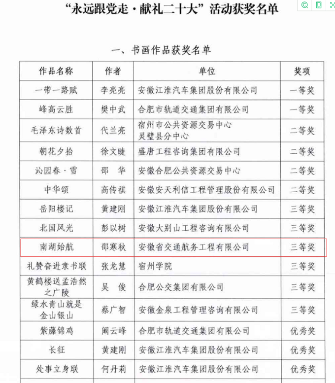 日前,由安徽省招標采購協會主辦的“永遠跟黨走·獻禮二十大”作品征集評選活動獲獎作品名單揭曉!經過激烈競爭,安徽交航公司《南湖始航》書法作品榮獲書畫類作品三等獎。