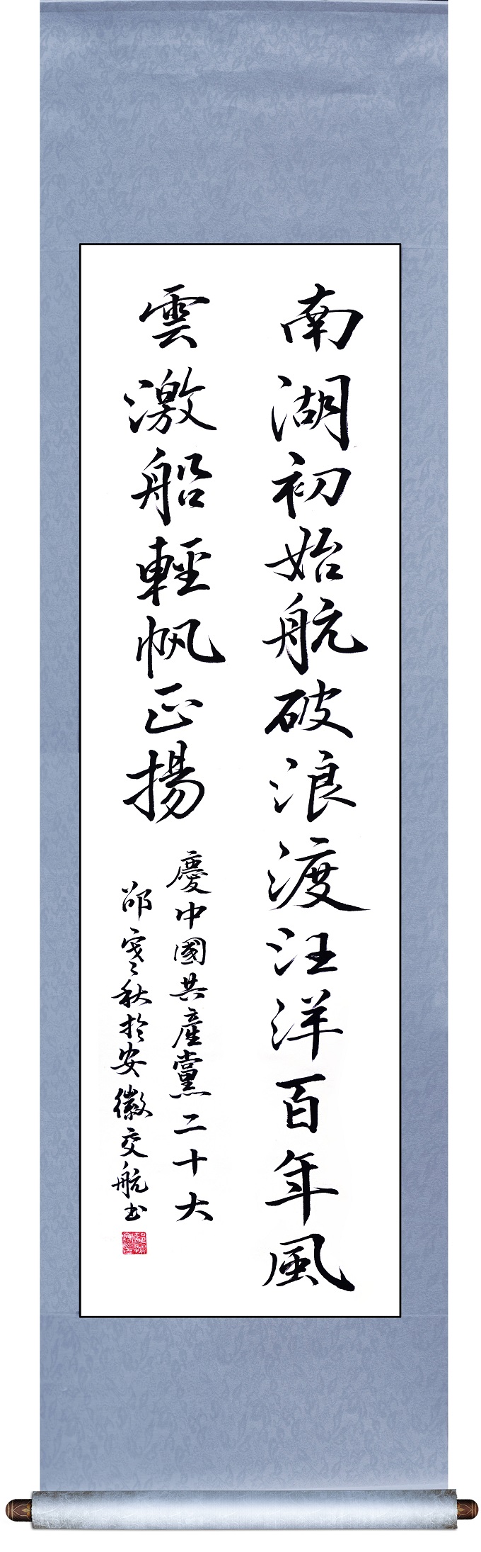 作品《南湖始航》是在黨的二十大即將召開之際,公司職工邵寒秋以書墨寄情,寫下《南湖始航》向黨的二十大獻禮。該作品回望了南湖紅船播下中國革命的火種,開啟中國共產黨跨世紀的航程。歌頌了歷經百年風云激蕩,黨始終秉承初心為人民謀幸福、為民族謀復興的偉大成就。