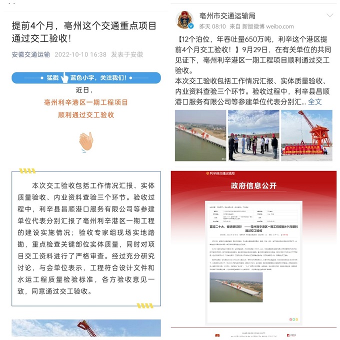 近日,安徽省交通運輸廳、亳州市交通運輸局、利辛縣交通運輸局相繼報道了安徽交航公司亳州利辛港區(qū)一期工程項目提前4個月交工驗收的喜訊。