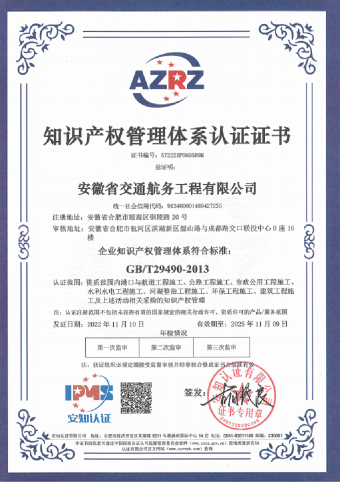 11月10日,安徽省交通航務工程有限公司知識產權管理體系順利通過認證,標志著安徽交航知識產權管理工作邁入全面提升新階段。
