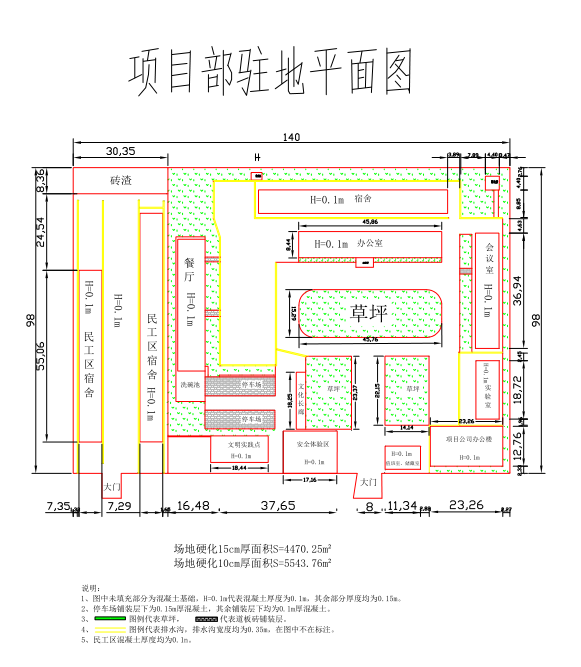 項目部現有單層活動板房51間(6.16米*3.64米*48間,6.16米*5.46米*2間,6.16米*14.56米*1間),雙層活動板房4排56間(6.16米*3.64米*53間,6.16米*7.28米*3間),總建筑面積約5193㎡;場地硬化總面積約10014㎡(其中15cm厚度約4470.25㎡,10cm厚度約5543.76㎡);其余綠化等附屬詳見拆除清單。